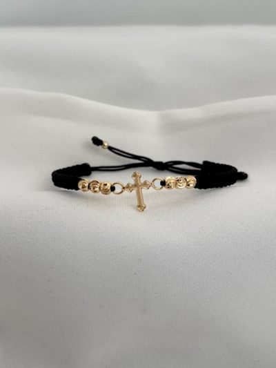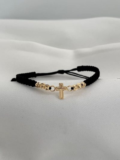 PULSERA NEGRA TEJIDA CRUZ GRIEGA BALIN DIAMANTADO