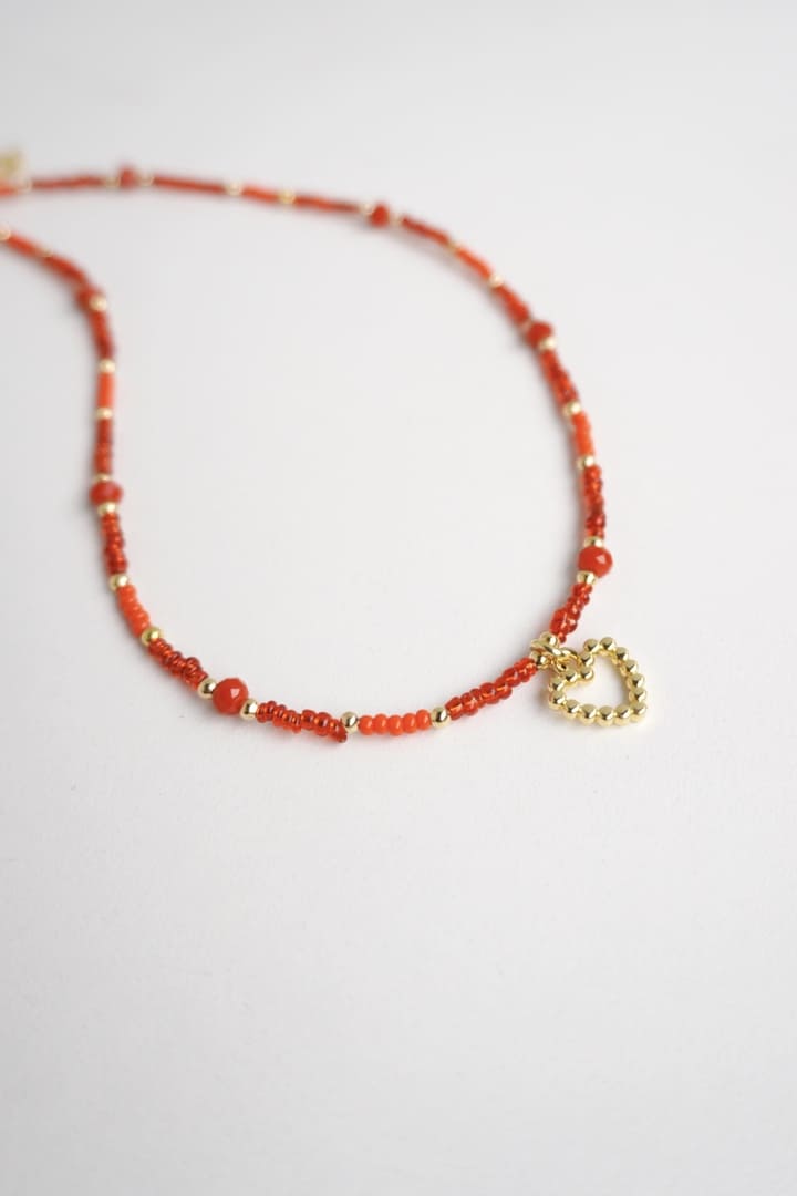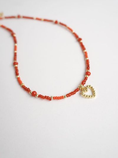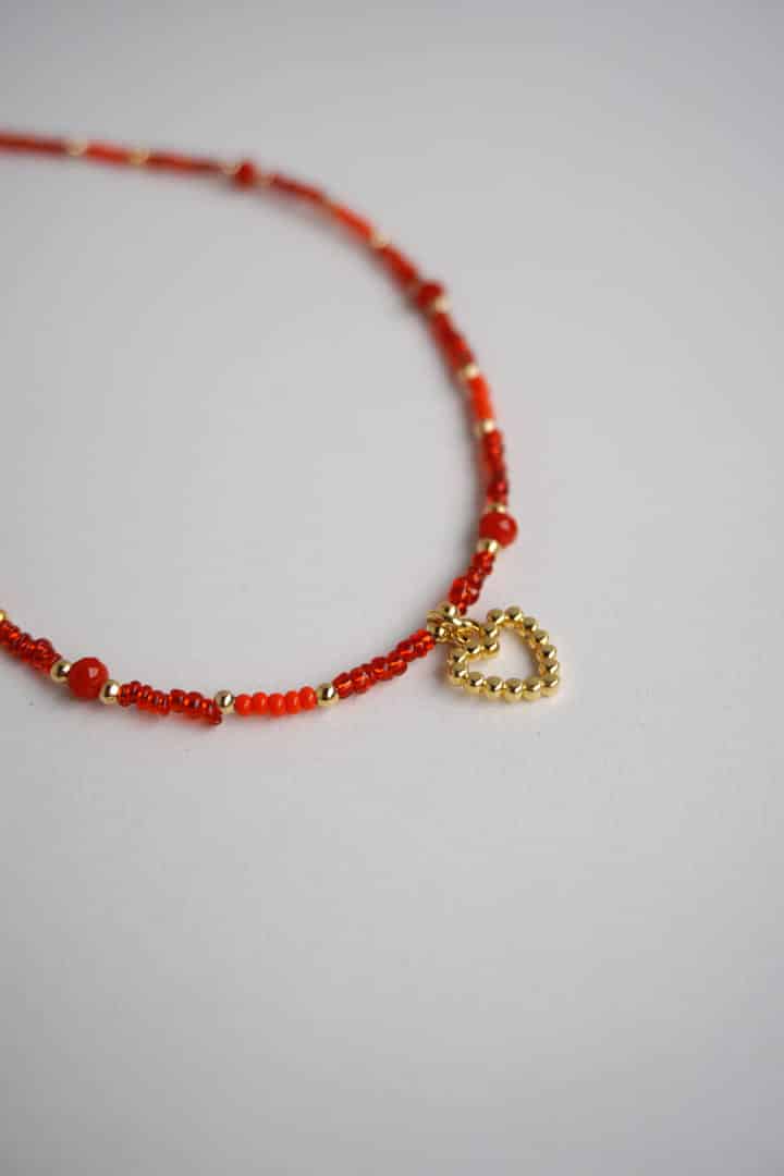 Una pieza llena de color y personalidad. Nuestra cadena con corazón horma destaca por su diseño delicado y femenino, acompañado de mostacillas y murano rojo.