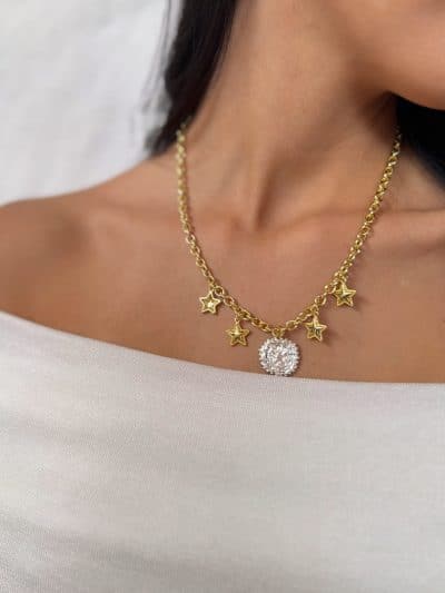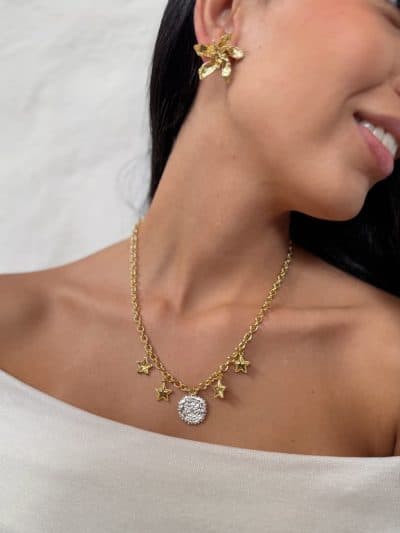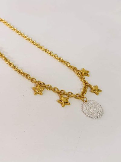 Collar CON DIJES DE ESTRELLA en dorado y baño de plata. Choker con perlas y murrinas, cadenita doble. Utilizala Sola o en conjunto, nuestras cadenas están hechas para que armes tu layering como más te guste.