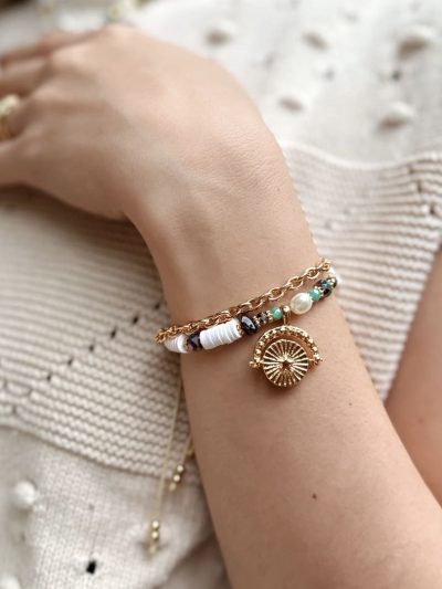 pulsera con mostacilla y perla del rio con dije reversible. El complemento perfecto para elevar cualquier look, con su hermoso diseño.