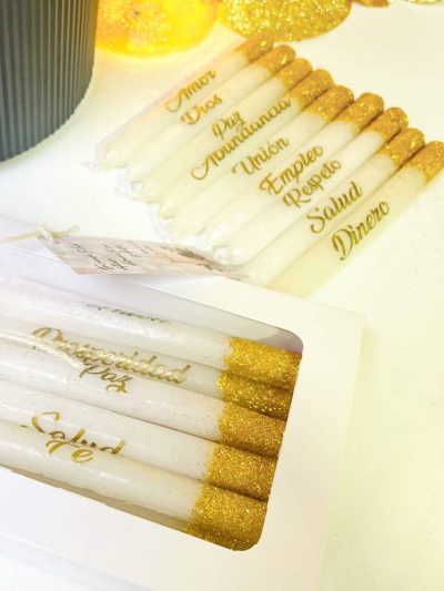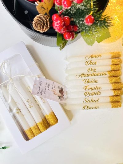 VELAS PERSONALIZADAS ESCARCHA DORADA CON CAJA