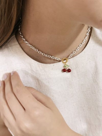 Detalles de con mostacilla, cerezas hechas a mano.- cadena de extension aprox 7cm.