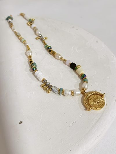 Collar con mostacillas y perlas del rio y dije reversible. Perfecto para ocasiones Especiales, combínala para armar un layering.